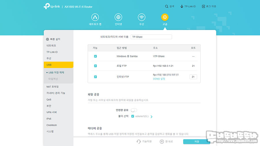 티피링크 Archer AX20에는 윈도우 Samba 형식, FTP 형식, 인터넷 FTP 방식, MAC 용 타임머신을 지원하기에 로컬 인터넷상에서는 폴더 형태에서 파일을 주고받는 형식의 Samba 기능을 지원하며