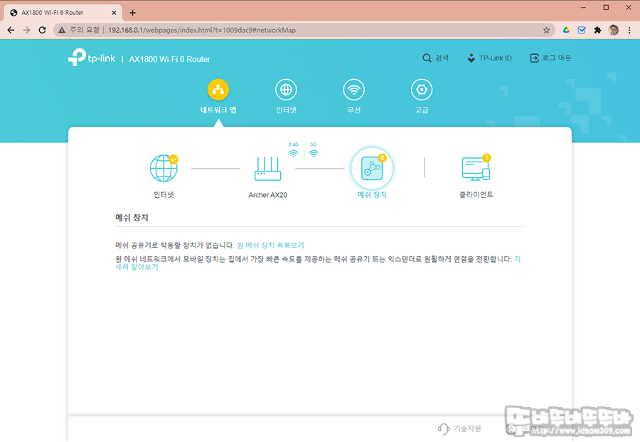 네트워크 맵에서는 인터넷 회선 정보, 공유기의 무선 인터넷 정보, 메쉬 장치(메쉬 장치가 있는 경우), 무선 기기 접속을 확인하는 클라이언트 메뉴로 구성되어있는데요.