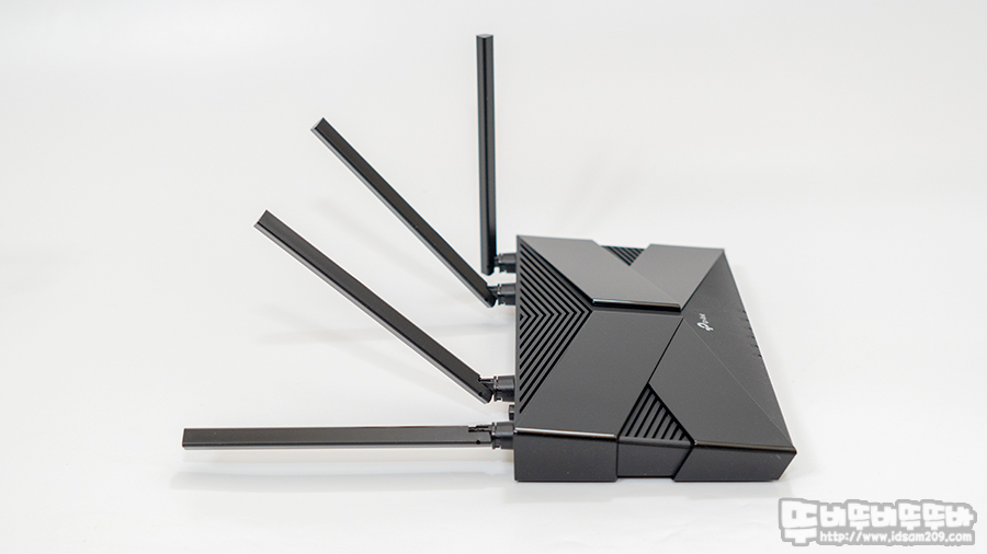 티피링크 Archer AX20 라우터의 하우징 상단은 사격형 형태에 X자 형태의 돌출부를 유광 플라스틱 처리하여 포인트를 주고 있으며 나머지 면적은 바닥 면에서 유입되는 공기가 빠져나갈 수 있는 환풍구 형태로 디자인되었습니다.
