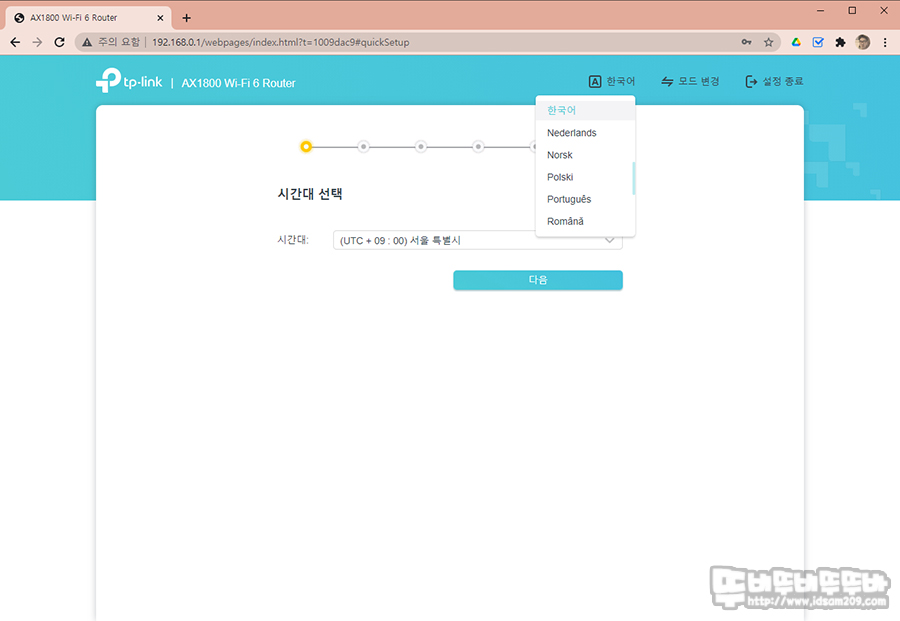 먼저 비밀번호를 변경 설정 후 다음으로 넘어간 후에 상단 메뉴에 언어를 한국어로 변경해줍니다.