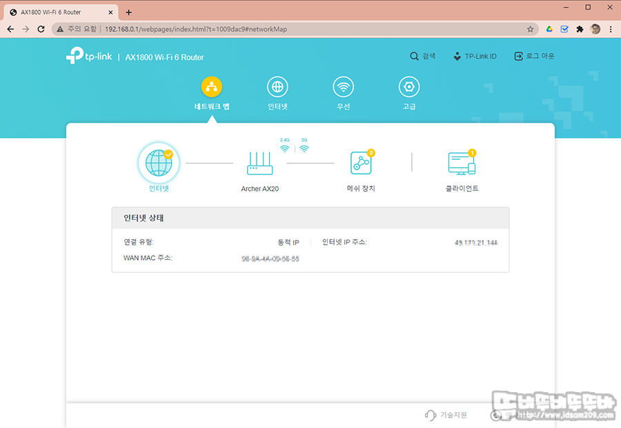 네트워크 맵에서는 인터넷 회선 정보, 공유기의 무선 인터넷 정보, 메쉬 장치(메쉬 장치가 있는 경우), 무선 기기 접속을 확인하는 클라이언트 메뉴로 구성되어있는데요.