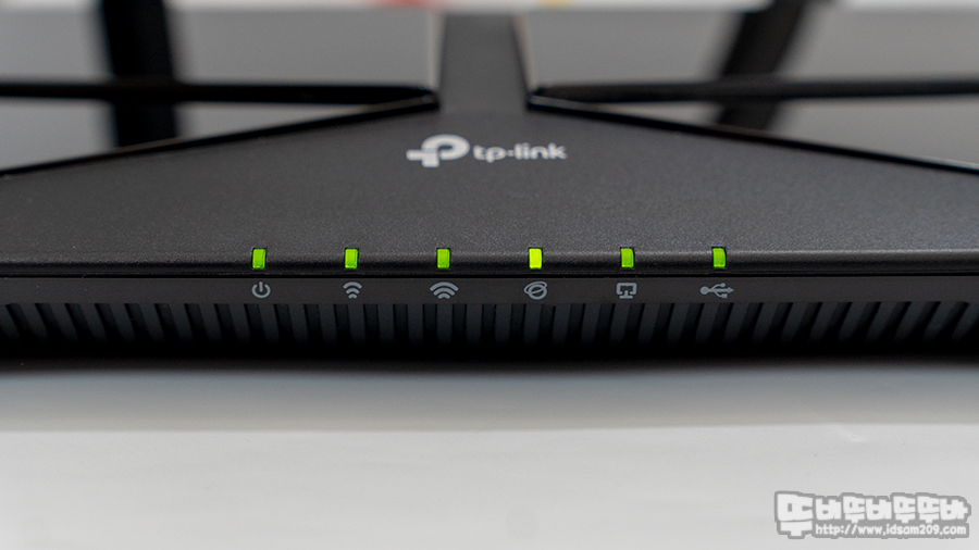 전면 모서리 부분의 LED 인디케이터는 왼쪽부터 전원, 무선 2.4 GHz, 무선 5 GHz, 인터넷, 랜 포트, USB 상태를 Green LED로 알려주며 점멸과 점등으로 상태를 확인할 수 있으며 특히 인터넷 연결이 되지 않는 경우 Orange LED 표시됩니다.