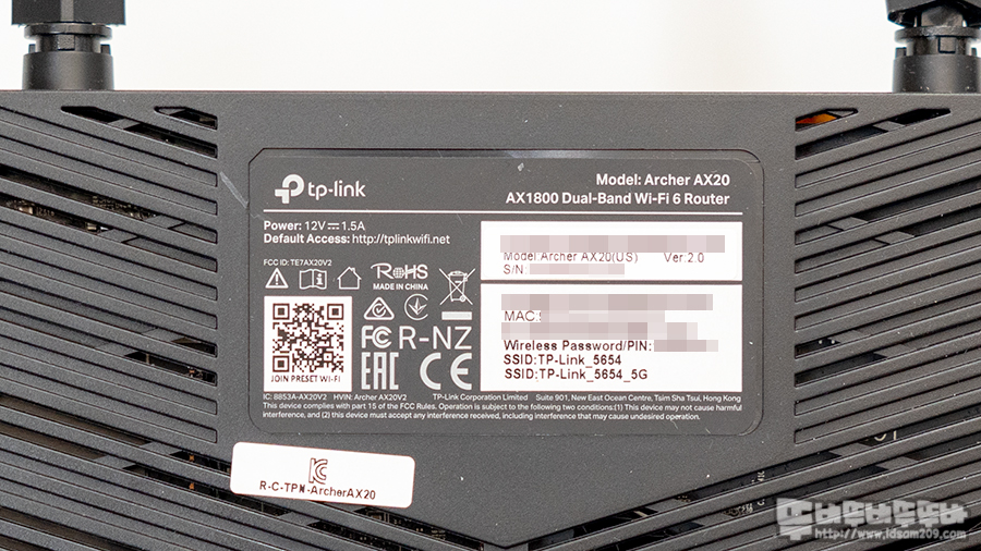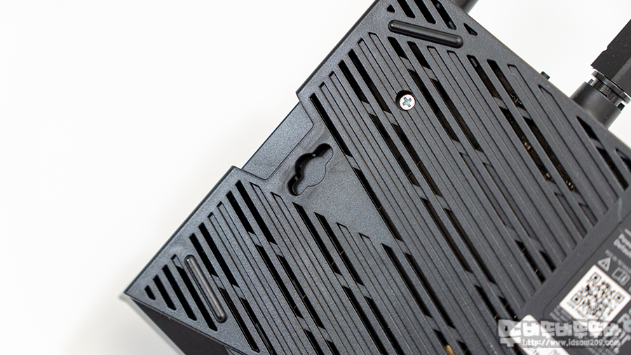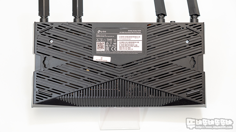 티피링크 Archer AX20 바닥 면에는 통풍을 위한 디자인으로 되어있으며 좌우에는 벽걸이 홀더가 있지만, 관련 나사를 제공하지 않으며 중앙에 라벨 스티커는 Wi-Fi의 초기 SSID와 비밀번호, 제품 시리얼 정보가 인쇄되어 있어 처음 사용 시 세팅을 하지 않고 사용하지 않는 경우 라벨 정보를 참고하시기 바랍니다.