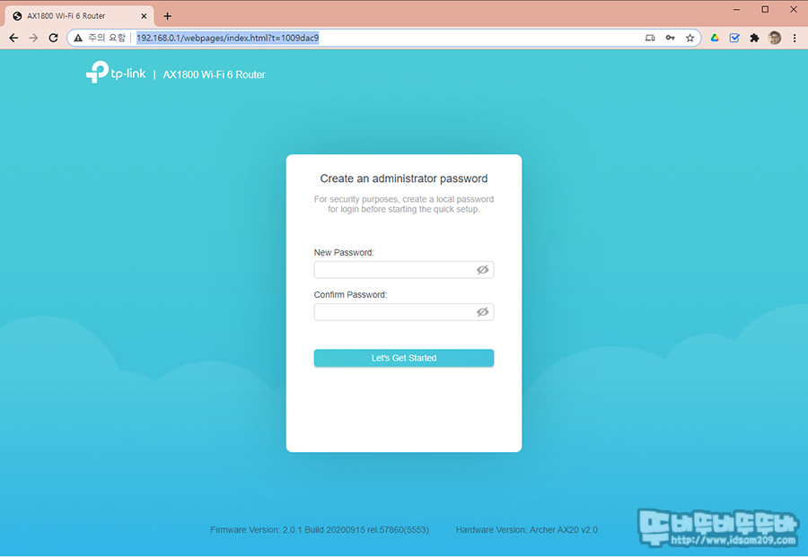 웹브라우저를 실행하거나 주소창에 192.168.0.1을 입력하면 관리자 메뉴로 접속하기 전 관리자 비밀번호를 변경하게 됩니다.