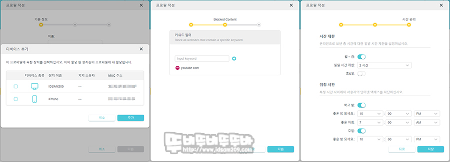 키워드 설정은 단어 검색 차단은 지원하지 않으며 웹사이트 주소 기반으로 제한하며 요일, 시간 등 세부적인 항목으로 자녀의 인터넷 사용을 제한할 수 있습니다.