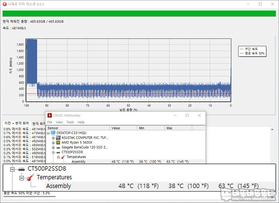 나래 온 더티 테스트 중에 마이크론 Crucial P2의 온도를 체크해보니 아이들시 온도 38도에서 벤치 테스트 중 최고온도 63도로 양호한 편이었는데요.
