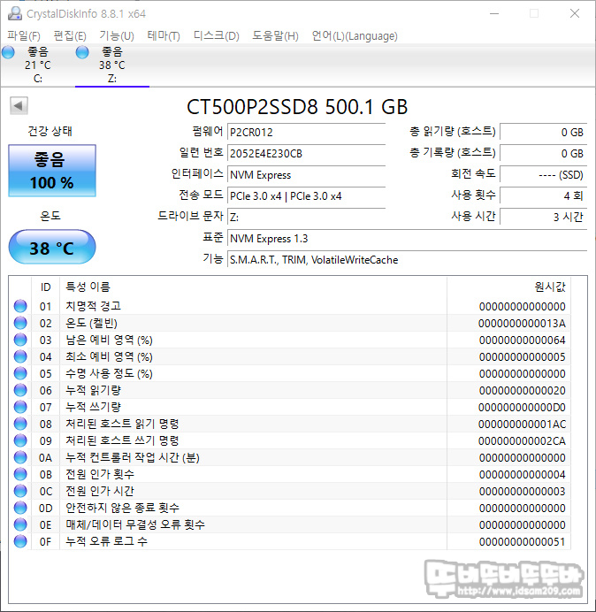 CrystalDiskInfo 정보 모습입니다. PCIe 3.0 x4에 NVMe 1.3 프로토콜, S.M.A.R.T, Trim 등 지원내용을 확인할 수 있으며 아이들시 온도 38도로 나름 쾌적한 사용이 가능해 보입니다.