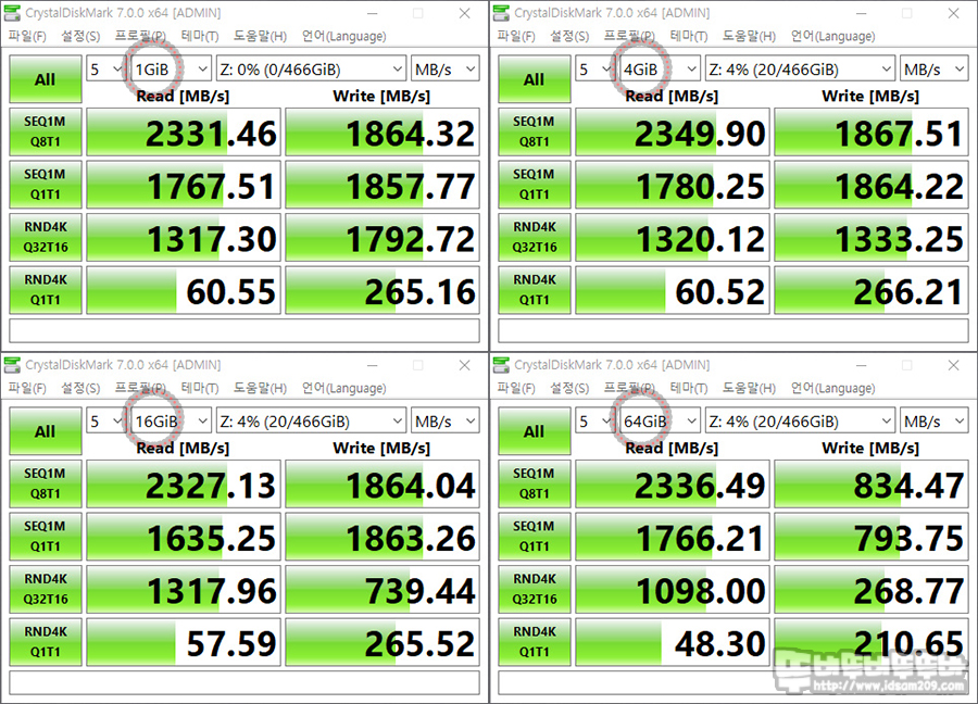 CrystalDiskMark 테스트의 경우 테스트 용량은 1 / 4 / 16 / 64 GiB로 변경하여 테스트해보니 용량이 늘어나면서 쓰기 부분에서 차이가 발생하는 것을 확인할 수 있는데요.