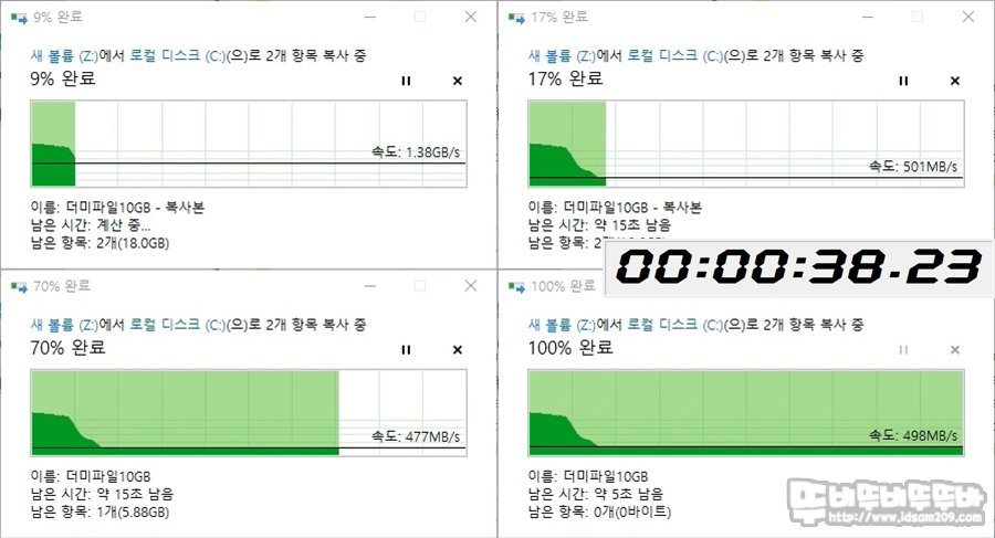 다른 저장 장치에서 마이크론 Crucial P2(Z 드라이브)에 파일 복사하는 쓰기 테스트를 위해 10GB 더미 파일 2개로 총 20GB 파일을 복사를 해보았습니다.