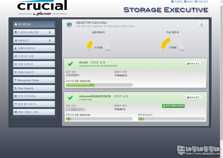 마이크론 홈페이지를 통해 다운 받을 수 있는 Crucial Storage Executive 프로그램을 이용하면 디스크 관리와 펌웨어 지원, 모멘텀 캐시 기능을 사용하여 약간의 성능 향상으로 사용이 가능합니다.