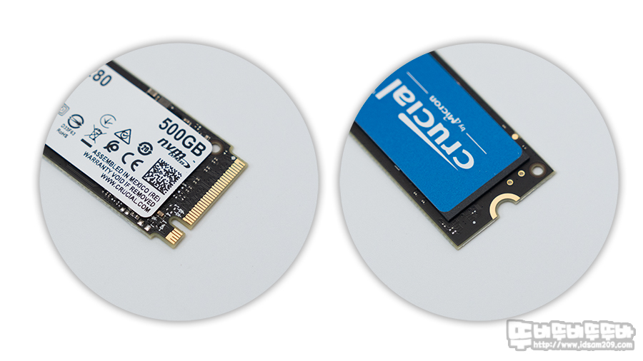 마이크론 Crucial P2 M.2 NVMe 아스크텍 (500GB) 모습을 살펴보면 M키를 사용하는 전형적인 2280 규격의 M.2 SSD 모습이며 고급진 블랙 PCB에 부품을 실장하고 제품의 정보를 담은 라벨을 부착한 게 외형적 특징이며 안정적인 M.2 SSD 사용을 위한 TRIM, SLC캐싱, S.M.A.R.T, ECC 기능을 지원하고 있습니다.