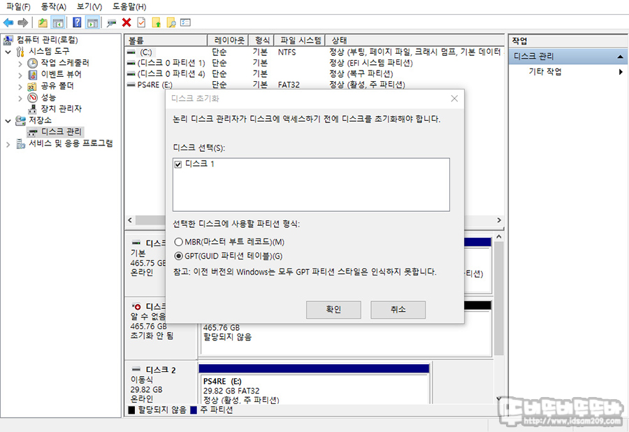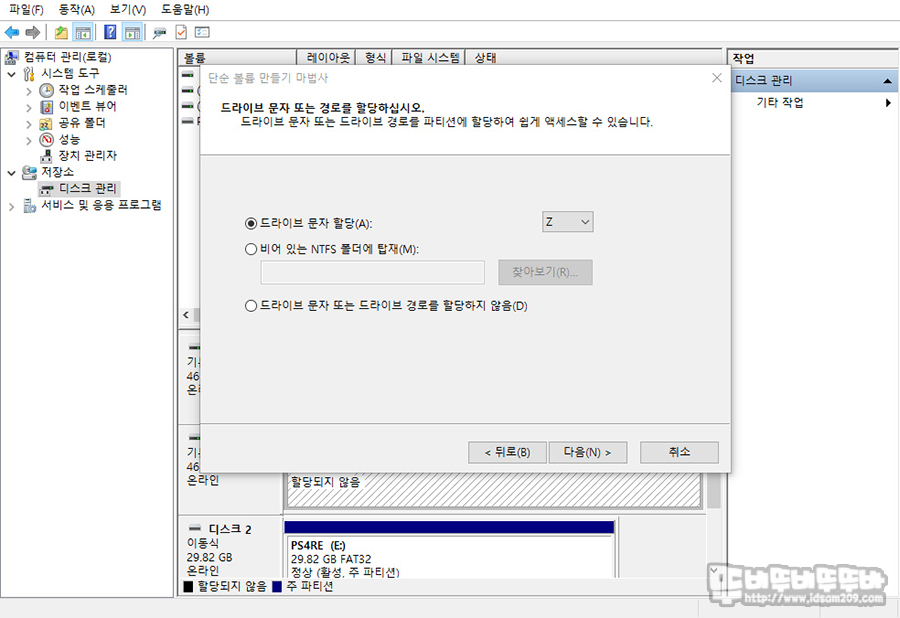 M.2 SSD P2 장착 후 윈도우즈 부팅 후 컴퓨터 관리 - 디스크 관리를 통해 디스크 초기화로 사용 가능하게 만들어 주는 과정을 거치면서 드라이브 명은 Z 드라이브로 설정하였습니다.