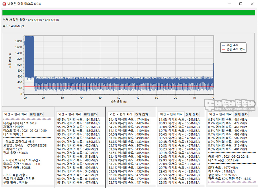 나래 온 더티 테스트에서는 DRAM Less 답게 SLC 캐시 영역을 벗어나는 95% 영역에서 부터 속도 저하가 발생하며 이후 평균속도 500 MiB/s로 진행됩니다.