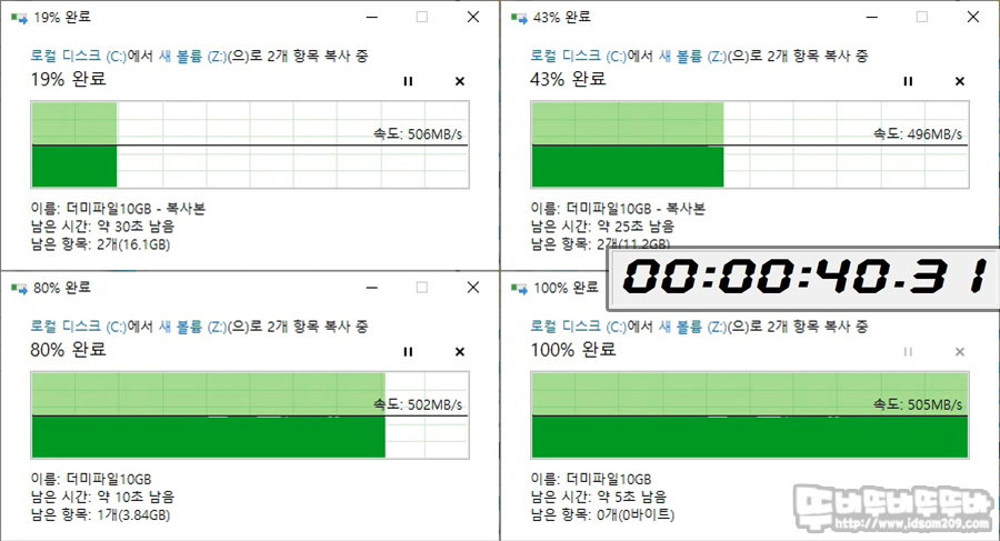 다른 저장 장치에서 마이크론 Crucial P2(Z 드라이브)에 파일 복사하는 쓰기 테스트를 위해 10GB 더미 파일 2개로 총 20GB 파일을 복사를 해보았습니다.