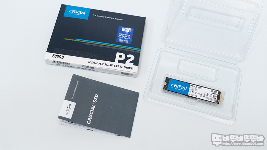 제품의 구성은 제품 안내서와 투명 플라스틱 케이스에 담겨있는 M.2 SSD P2로 구성되어있습니다.