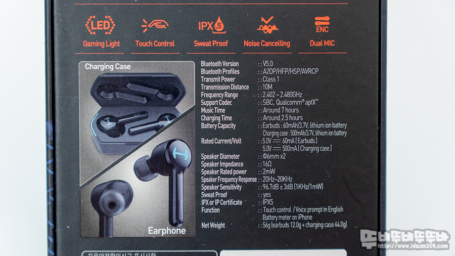 ▷ 무게 56g (이어버드 12g, 충전 케이스 44g)