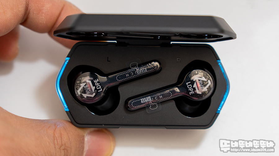 이전 모델과 다르게 양쪽 사이드 부분에 LED 라이팅으로 배터리 상태를 알 수 있게 디자인된 게 특징이며 이어버드의 스틱 부분의 충전 단자 모습 그리고 이어버드 좌우를 구분하는 L, R 각인을 확인할 수 있습니다.