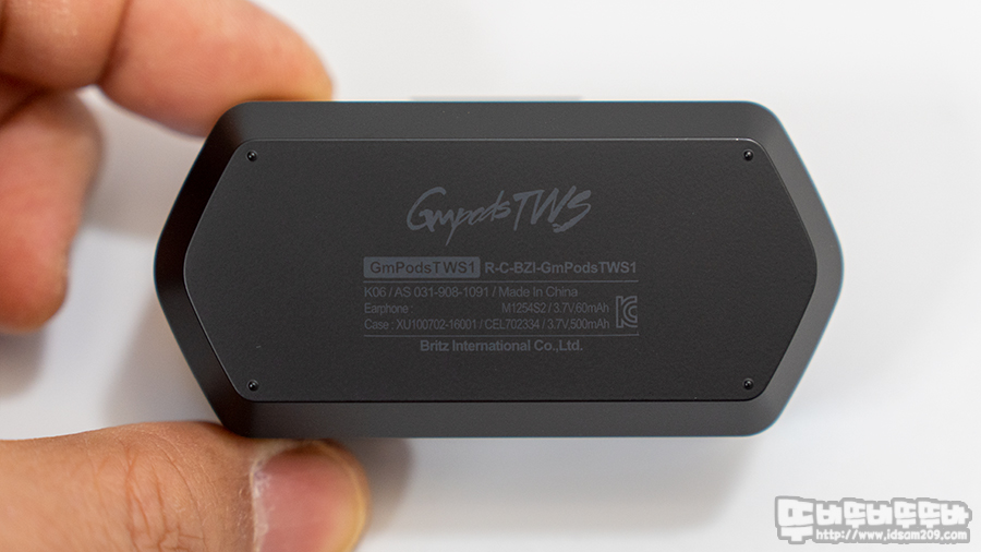 브리츠 GmPodsTWS1 게이밍 블루투스 이어폰 충전케이스 뚜껑에는 H 각인이 새겨진 원형 금속을 사용하여 포인트를 주고 있으며 바닥 면에는 브리츠의 시그니처 폰트가 사용된 모델명과 고객지원센터 전화번호, 배터리 KC 인증 정보를 확인할 수 있습니다.