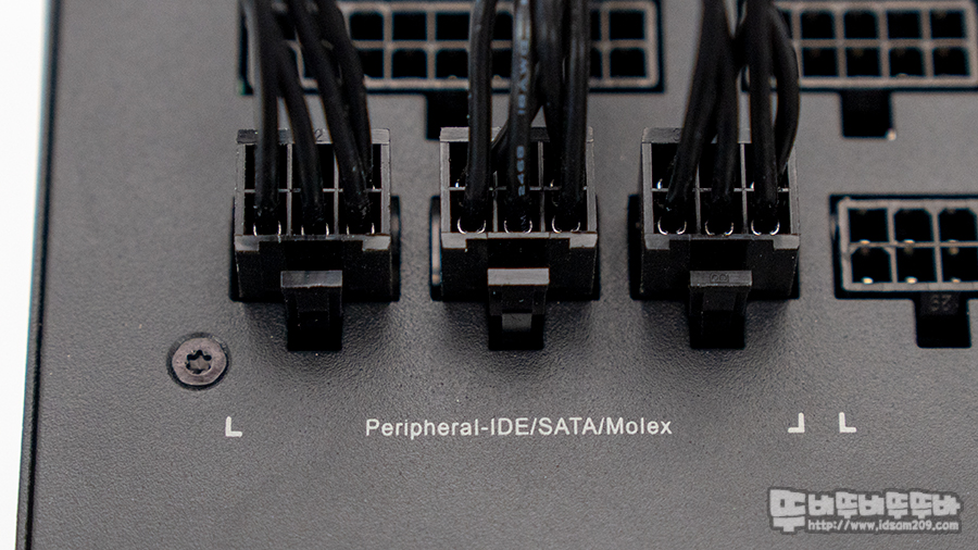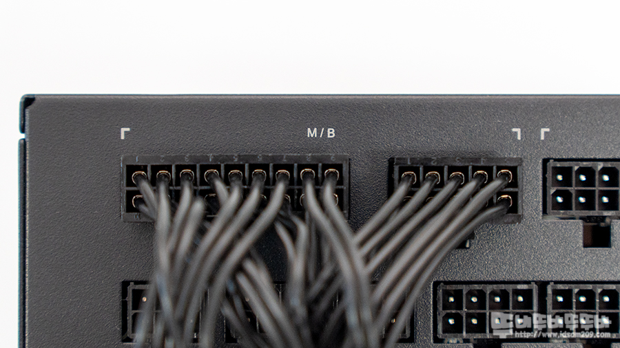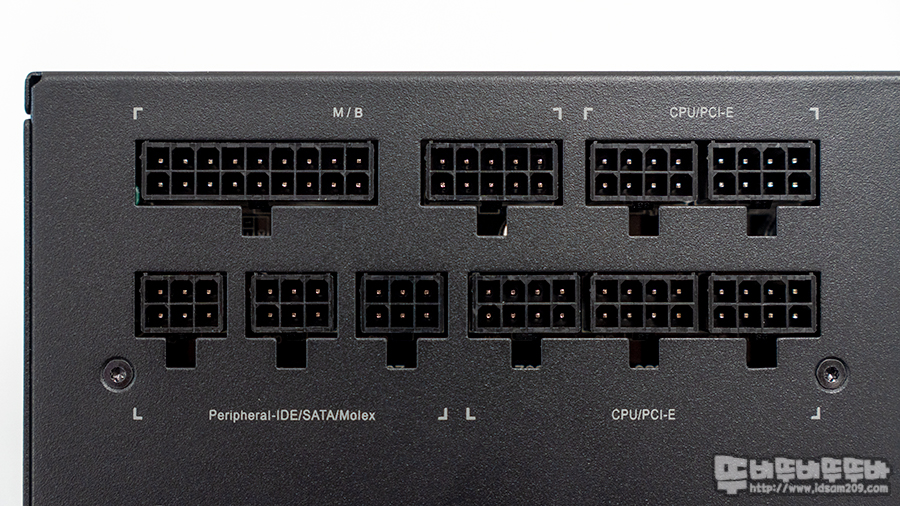 풀 모듈러 소켓 구성을 살펴보면 18+10핀 구성의 메인보드 전용 소켓, 8핀 구성의 CPU 보조전원 및 VGA 보조전원 소켓, 6핀 구성의 IDE, SATA 전원 소켓 모습을 확인할 수 있습니다.