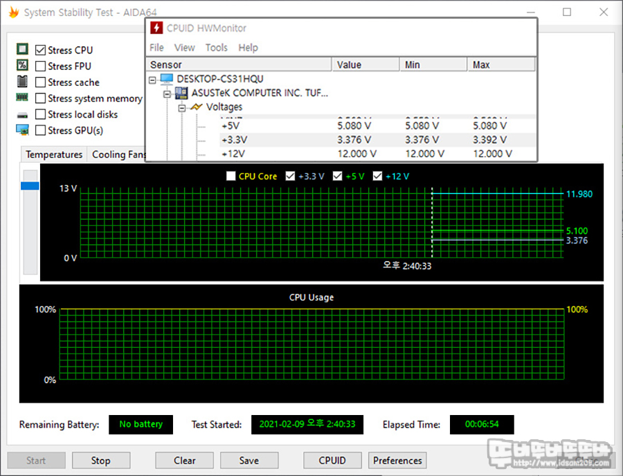 파워 전용 테스트가 가능한 로드기를 개인적으로 테스트할 수 없기에 일반적인 시스템을 활용하여 확인할 수 있는 테스트인 AIDA64 안정성 테스트와 OCCT 소프트웨어를 이용한 부하 테스트로 전압 상태를 확인해보았습니다.