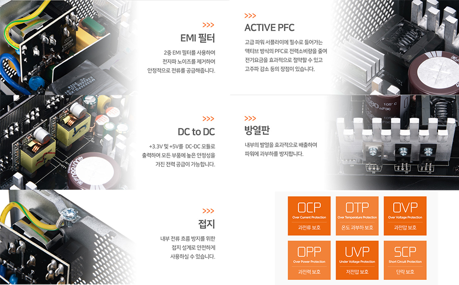 GIGABYTE P750GM 80PLUS GOLD 풀 모듈러 파워서플라이는 높은 온도에서도 안정적인 전력을 공급하는 긴 수명의 일본산 캐패시터 사용, 전원 공급 시 유입되는 노이즈를 차단하는 2중 EMI 필터와 안정적인 전원 공급을 위한 ACTIVE PFC, DC to DC 회로 구성 그리고 과정류 보호 (OCP), 온도 과부하 보호 (OTP), 과전압 보호(OVP), 과전력 보호(OPP), 저전압 보호(UVP), 단락 보호(SCP) 등 다양한 안전회로를 구성하고 있습니다.