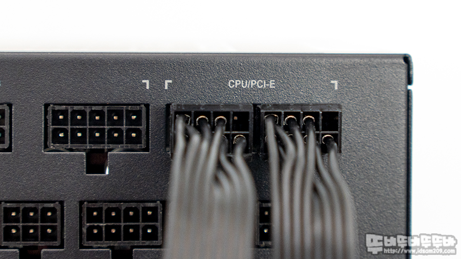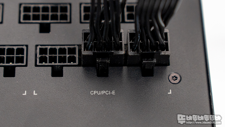 풀 모듈러 소켓 구성을 살펴보면 18+10핀 구성의 메인보드 전용 소켓, 8핀 구성의 CPU 보조전원 및 VGA 보조전원 소켓, 6핀 구성의 IDE, SATA 전원 소켓 모습을 확인할 수 있습니다.