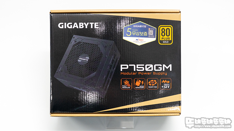 GIGABYTE P750GM 80 PLUS GOLD 풀 모듈러 파워서플라이 패키지에는 제품 이미지와 모델명, 제품의 특징을 표현하는 아이콘으로 풀 모듈러 방식, 일본산 캐패시터 사용, 20% 이하의 부하에서는 작동하지 않는 스마트 팬, 싱글 레일 +12V 등이 강조되고 있으며 80 Plus Gold 등급 인증과 보증기간 5년을 지원하는 유통사 피씨디렉트 정품 스티커를 확인할 수 있습니다.
