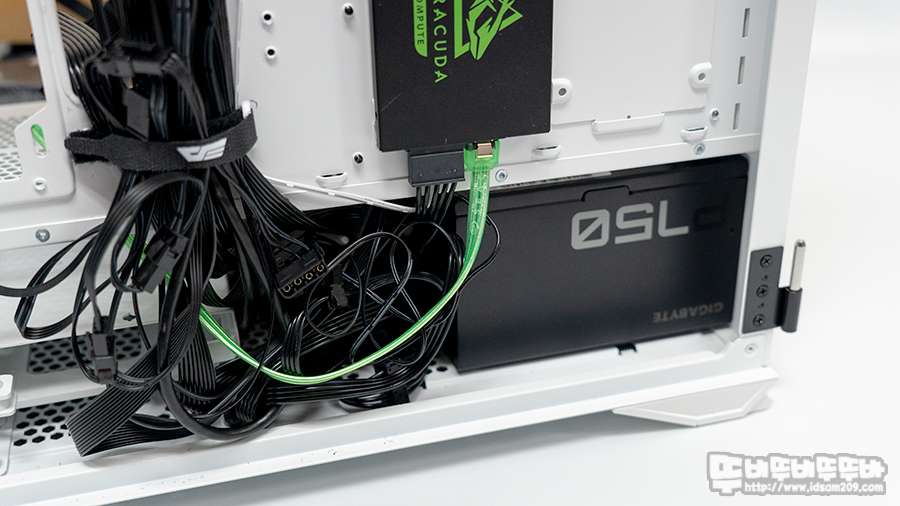 케이스 리뷰를 진행하는 게 있어 파워를 장착하여 조립해보았는데 140mm 길이의 파워 길이로 하단부의 케이블 정리할 수 있는 여유로운 공간을 제공과 미들 케이스에 장착 시 CPU 보조 전원의 여유로운 길이 덕에 편안하게 시스템 조립이 가능했습니다.
