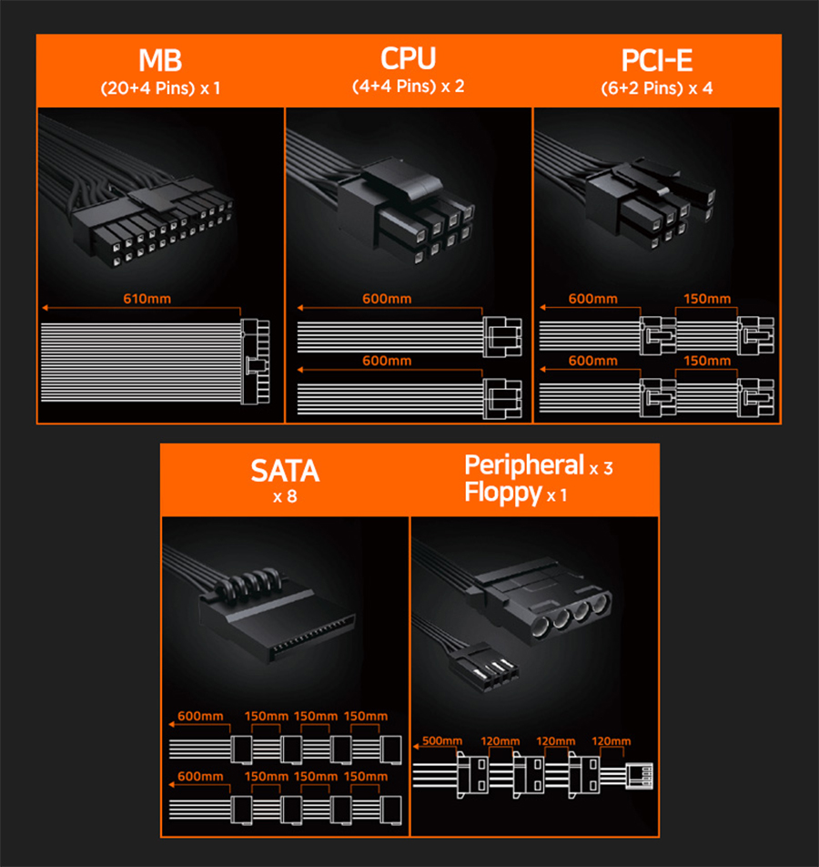 ▷ 20+4핀 구성의 메인보드 케이블은 610mm 길이로 1개