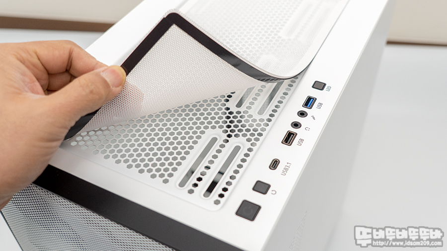 사이드 패널 타공면에 탈부착이 가능한 먼지 필터 모습.