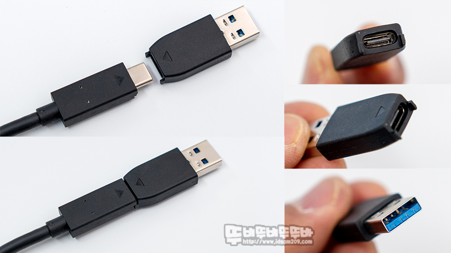 USB-C to A 변환젠더는 기본 케이블 몰딩과 결합되는 구조로 한쪽 끝부분에 돌기가 있어 구분되니 참고하셔서 연결하기 바랍니다.