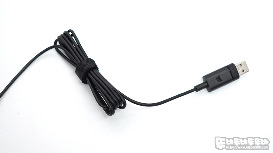 PCV 재질의 케이블과 USB 단자 모습. USB 단자 몰딩에는 커세어 로고가 인쇄되어있어 PC 본체 뒷면에 USB 포트에 연결되어있더라도 커세어 마우스 임을 확인할 수 있게 도움을 줍니다.