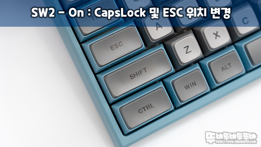 스위치 1번 On으로 설정 시 Caps Lock / R_Ctrl 위치 변경이 가능하며 스위치 2번 On으로 설정 시 Caps Lock을 ESC로 기본 사용, Fn 조합으로 Caps Lock 기능으로 사용할 수 있습니다.