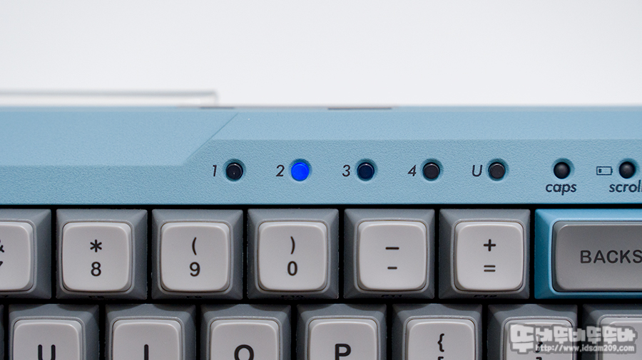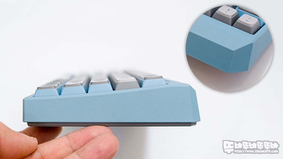 자체 경사를 가지고 있는 디자인이지만 키보드 위쪽에는 멀티 페어링 스위치 내장으로 돌출되게 디자인되어 살짝 레트로 느낌을 주고 있습니다.