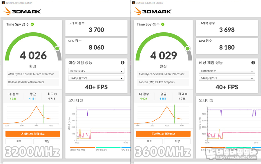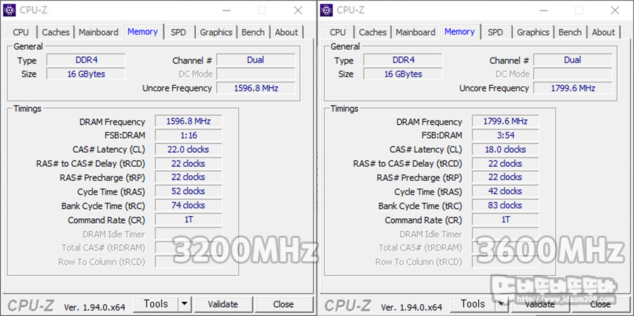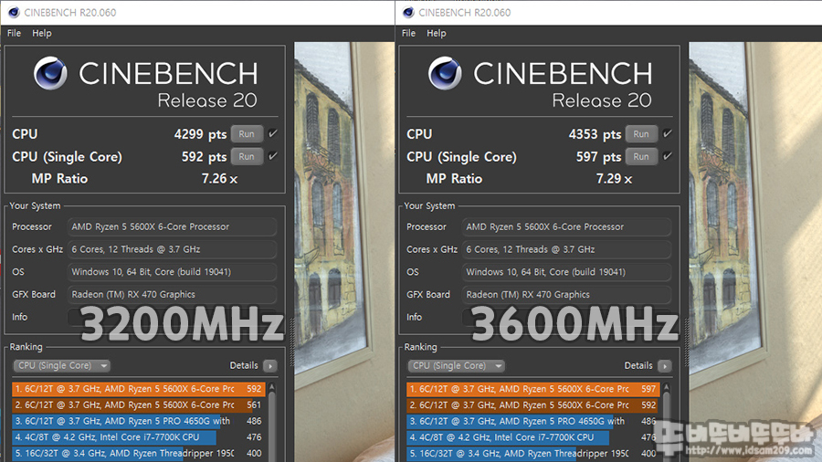 기본으로 3200MHz (22-22-22-52 1.20V) 클럭과 약간의 오버로 3600MHz (18-22-22-42 1.35V) 클럭으로 성능 비교를 해보도록 하겠습니다.