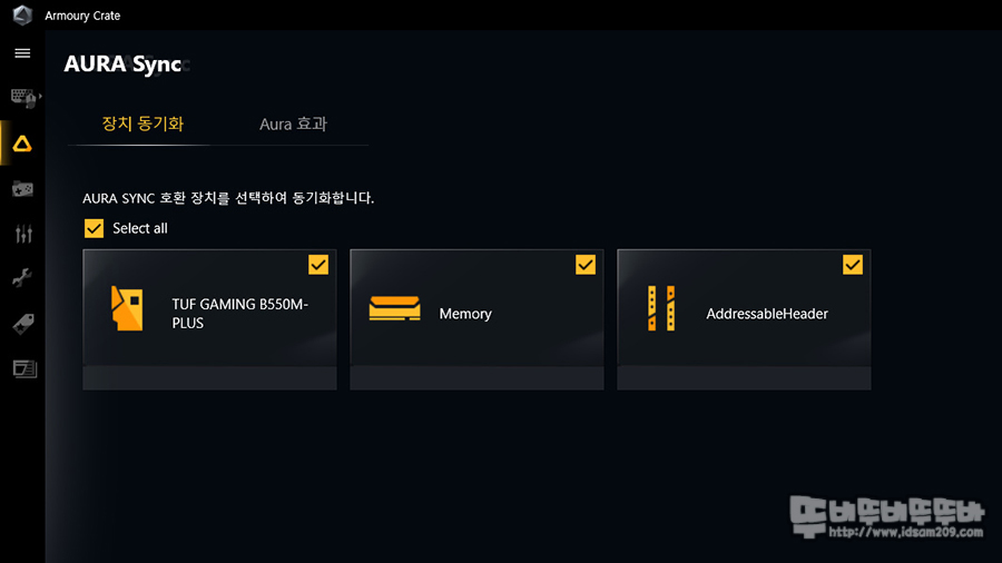 동기화 메뉴에서 시스템 구성에서 ARGB가 사용되는 모든 제품을 선택하거나 메모리만 선택하여 개별적으로 표현이 가능합니다.