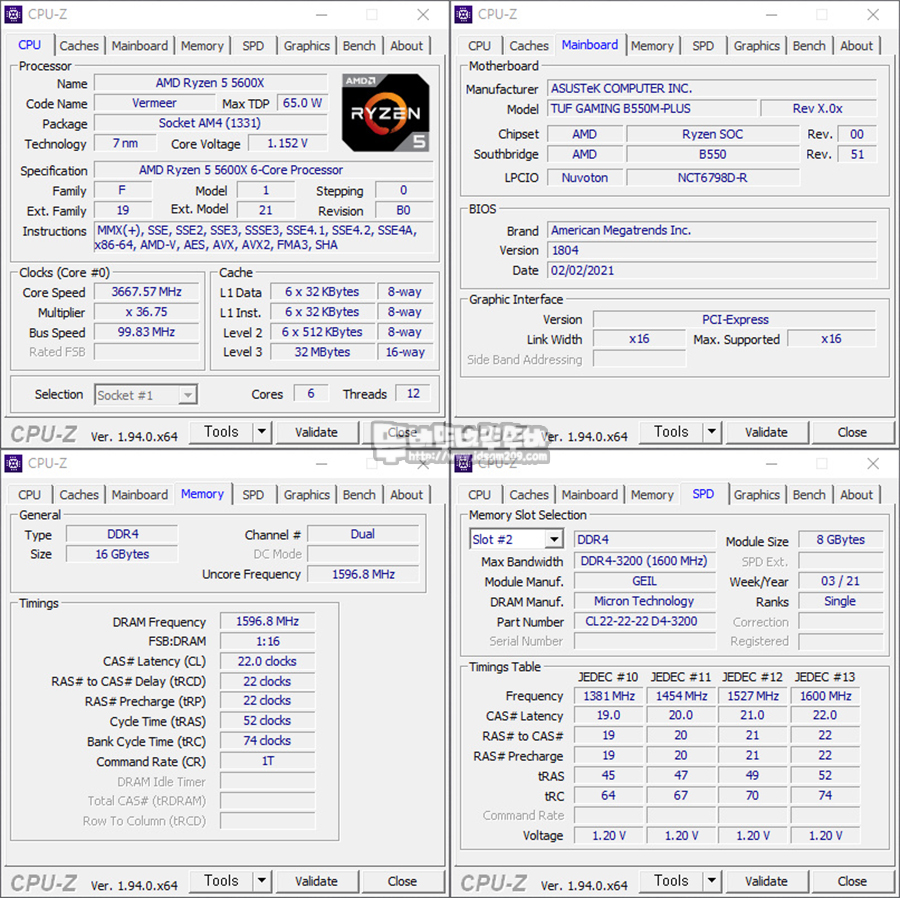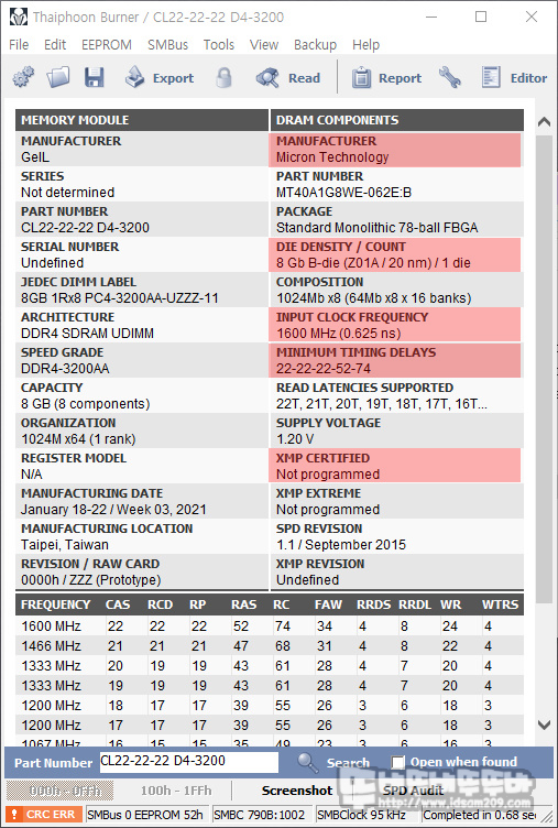 타이푼 버너로 메모리 모듈 정보를 살펴보니 마이크론 B다이 메모리가 사용되었으며 XMP 프로파일이 지원되지 않는 것을 확인할 수 있는데요.