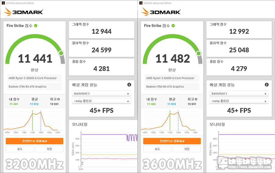 3DMARK 테스트에서는 AMD 라데온 RX470 그래픽카드를 사용 중이기에 그래픽 점수는 제외하고 CPU 및 피지컬 스코어를 확인 시 소폭으로 향상된 성능을 확인할 수 있습니다.