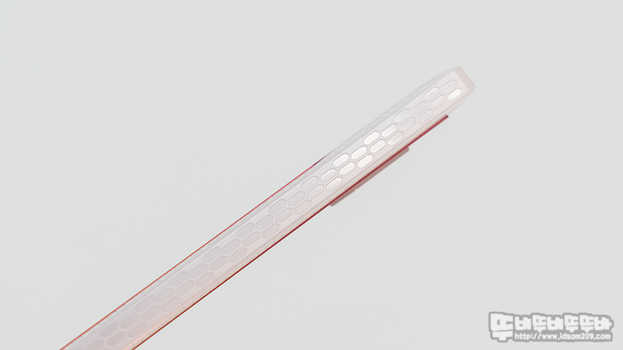 앞/뒤 대칭형으로 디자인된 메모리 전면에는 이전 제품과 동일한 레드 컬러 히트싱크에 타공 처리가 적용되어 메모리 발열 → 방열판 → 상단 히트 스프레드로 전달하는 MTCD 기술을 그대로 적용하고 있습니다.