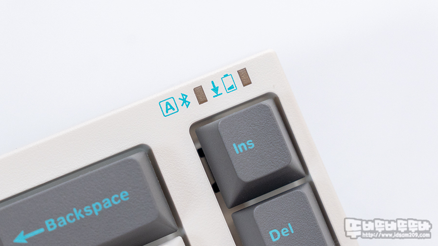 키보드 우측 상단의 LED 인디케이터는 유선일 때 Cap Lock, Scroll Lock, 무선일 때 블루투스 작동, 배터리 잔량 표시로 사용됩니다.