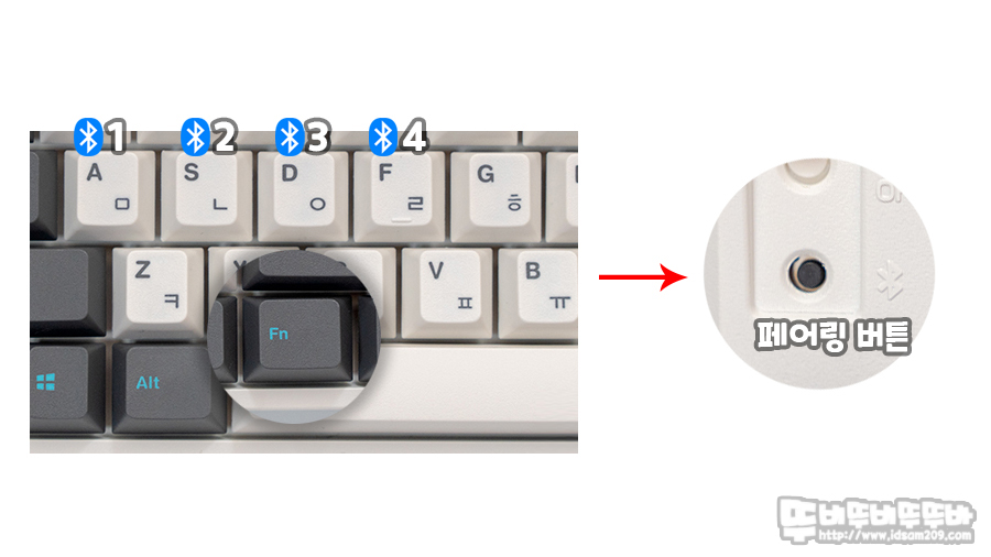 기본적인 페어링 방식이 기기 등록을 하고 싶을 때 조합 키 (예:Fn + A(1))를 누르고 키보드를 뒤집어서 페어링 버튼을 눌러 준 후 디바이스의 블루투스 메뉴에서 연결을 통해 페어링 완료가 되는데요.