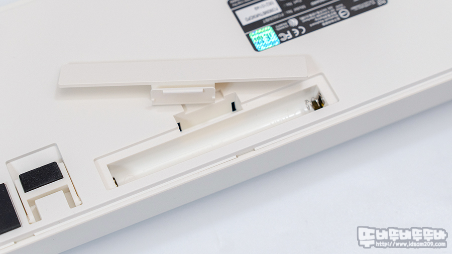 키보드 하판을 살펴보면 위/아래로 미끄럼 방지하는 패드와 건전지 소켓, DIP 스위치, 블루투스 On/Off 스위치, 블루투스 페어링 버튼을 확인할 수 있습니다.