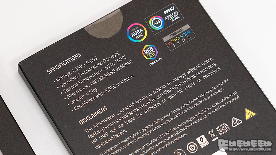 사용 전압과 148 X 38.9 X 8.5 mm 크기, 58g 무게 그리고 JEDEC 표준규격으로 제작된 메모리임을 강조하고 있네요.