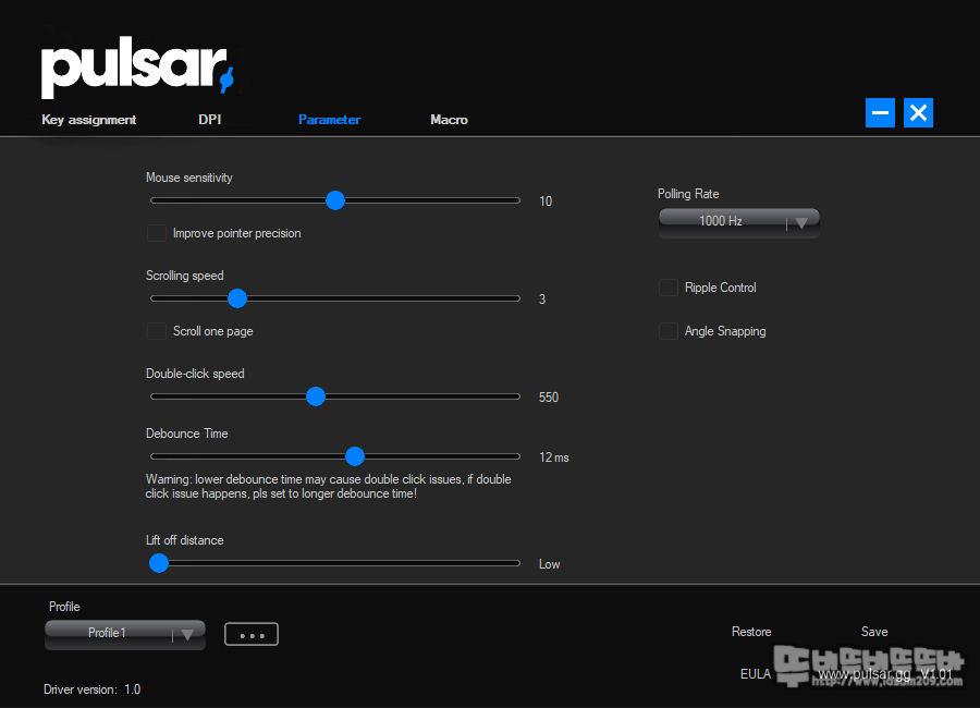 파라미터 메뉴에서는 기본적인 마우스 감도, 휠 스크롤 속도 설정과 더블 클릭 속도, 디바운스 타임, LOD 설정, 리플 컨트롤과 앵글 스냅핑을 지원합니다.
