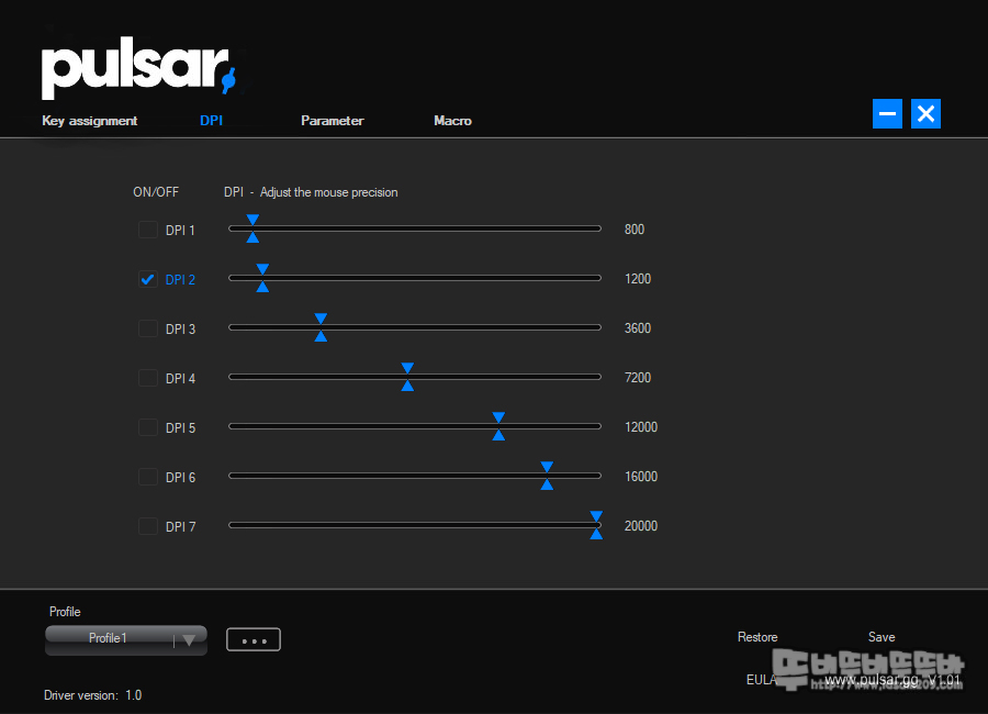 DPI 메뉴에서는 7단계의 DPI 값을 설정할 수 있는데요.