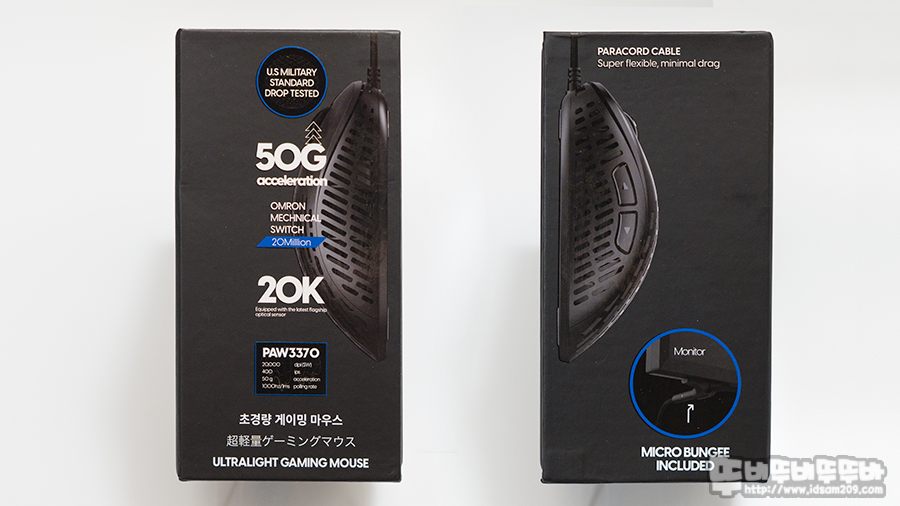 US 밀리터리 스탠다드 드롭 테스트를 통과, 50G 가속, 2천만 회 옴론 스위치 사용, 최대 20,000 DPI 지원, 픽셀아트 PAW3370 센서를 사용한 초경량 게이밍 마우스, 파라코드 사용과 마이크로 번지 포함이라는 내용을 확인할 수 있습니다.