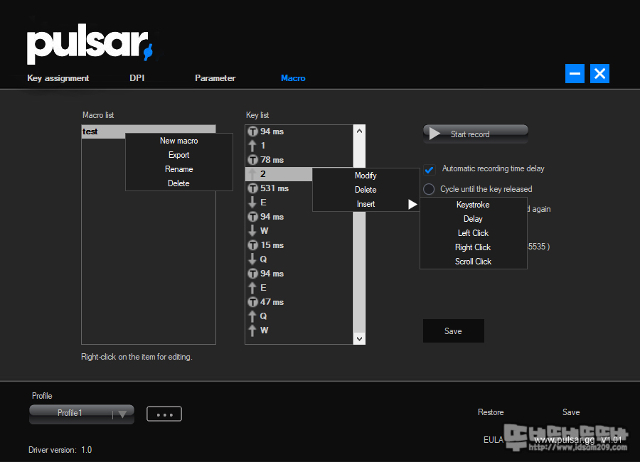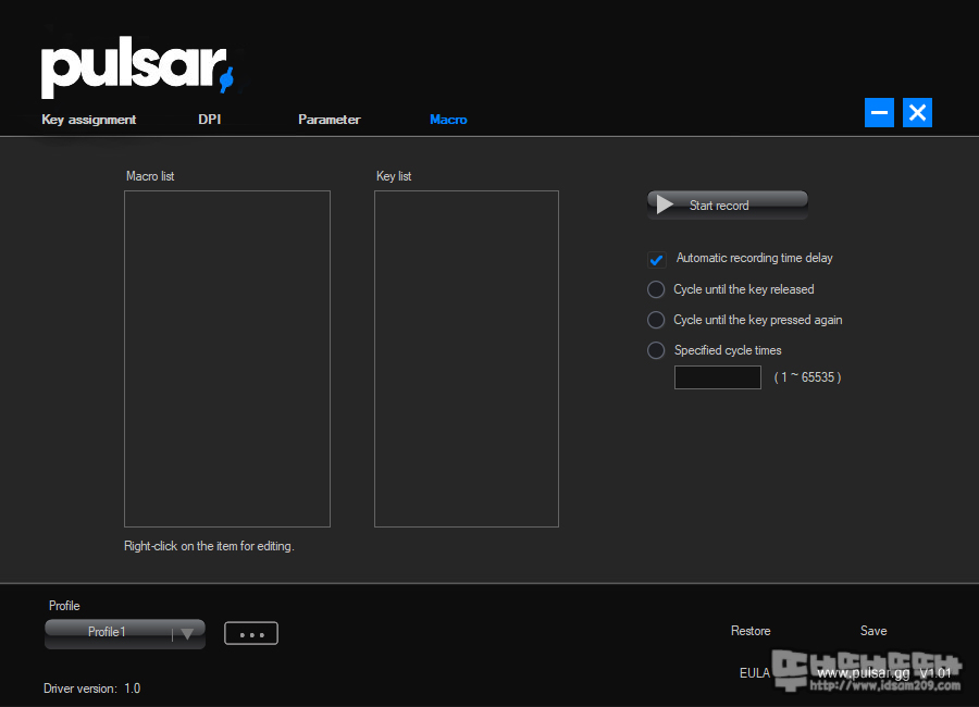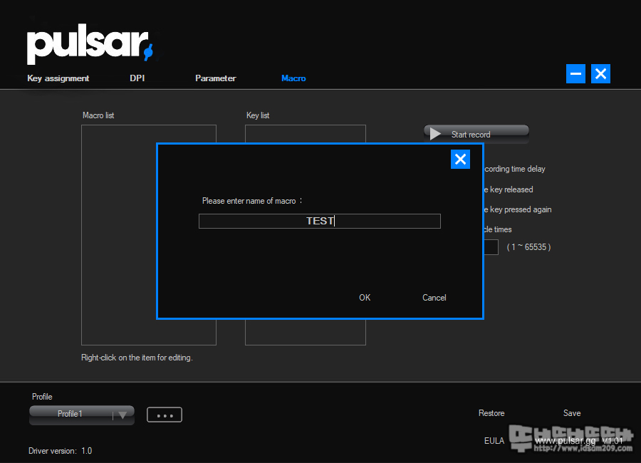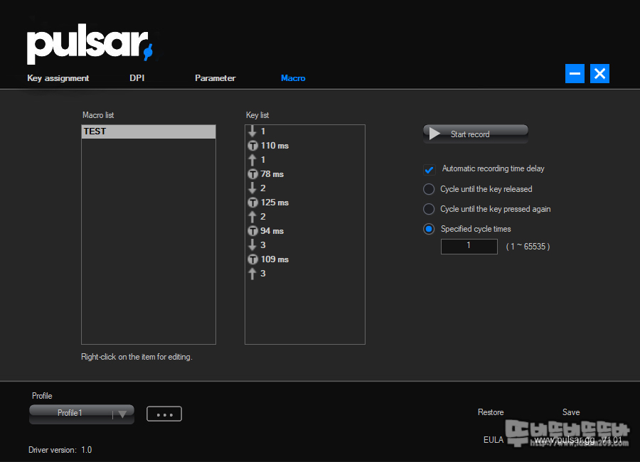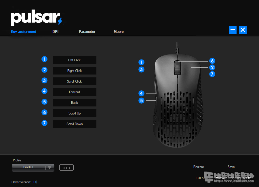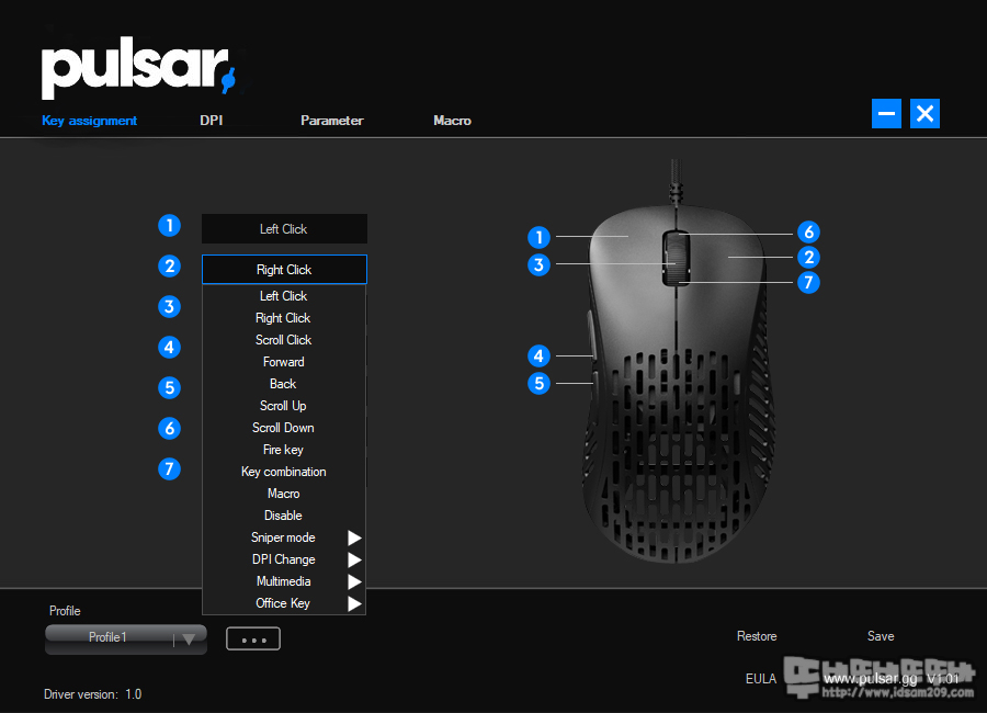 ▶ 버튼 기능을 부여하는 Key assignment 메뉴, ▶ DPI 설정하는 DPI 메뉴, ▶ 다양한 설정값을 세팅하는 Parameter 메뉴, ▶매크로 작업을 할 수 있는 매크로 메뉴로 구성되어있는데요.