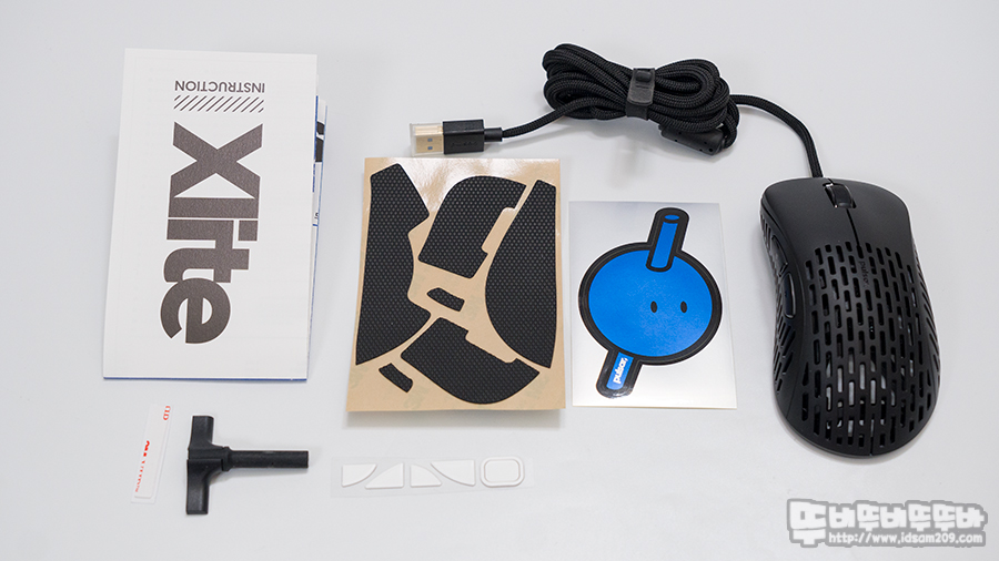 제품의 구성품으로는 간이 마우스 번지대, 여분의 마우스 피트, 논슬립 패치, Pulsar Xlite 마우스 본체, 스티커 및 사용 설명서로 구성되어있습니다.