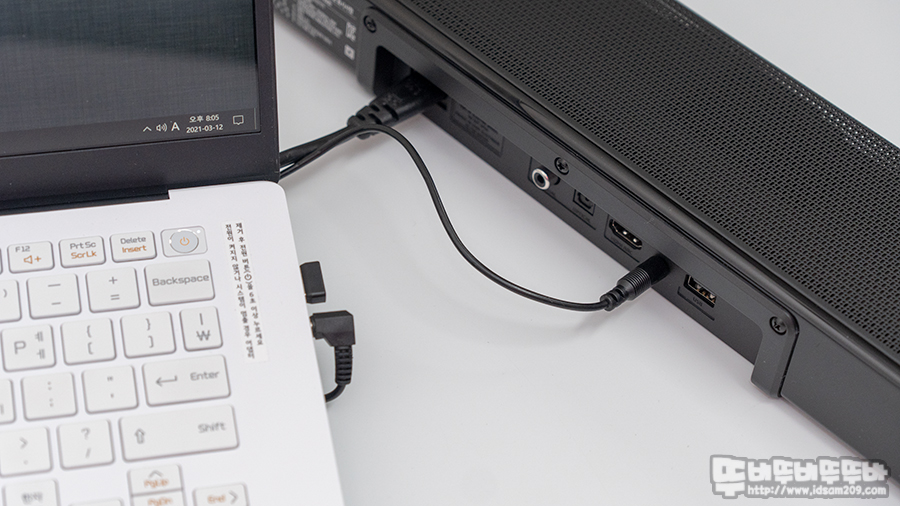 사운드 바를 사용 하고자 하는 소스기기를 사운드 바 뒤쪽의 다양한 입력 포트에 연결해줍니다.