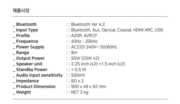 블루투스 버전 4.2 지원, 블루투스, AUX, OPTICAL, COAXIAL, HDMI ARC, USB 입력 지원, 57.1mm/38.1mm 2 Way 스피커 듀얼 구성, 최대 출력 50W의 성능을 지원하고 있습니다.